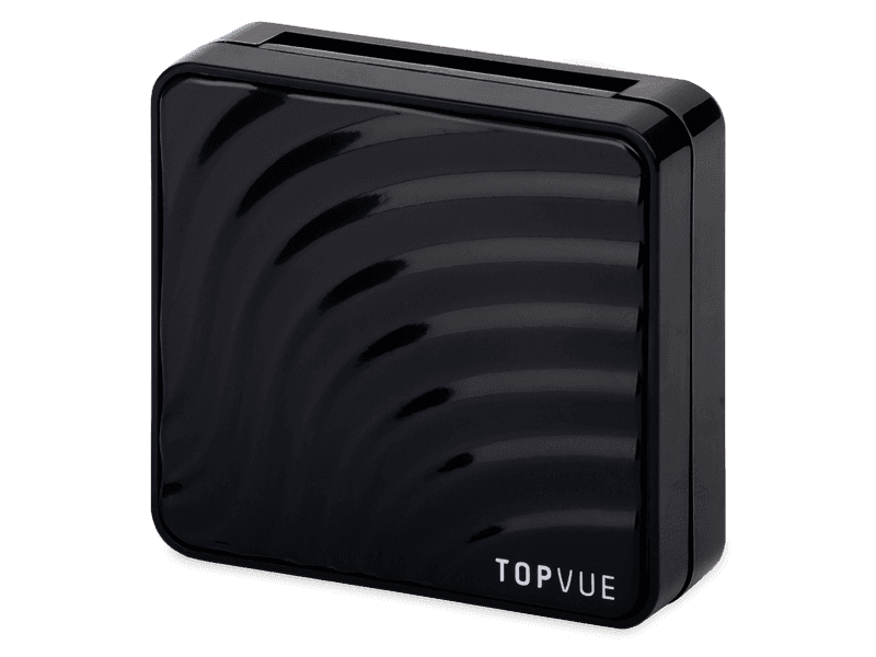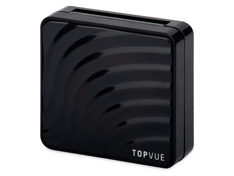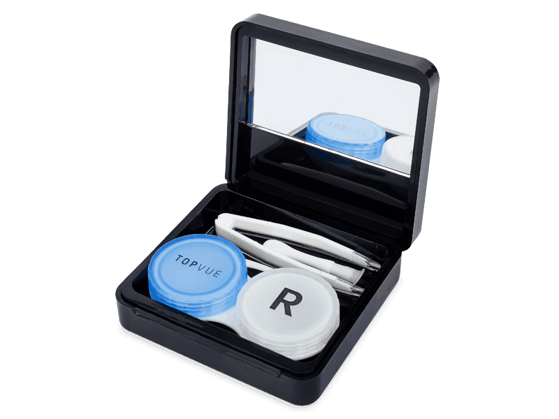 Černá kazetka značky TopVue s moderním designovým vzorem obsahuje zrcátko, pinzetu s měkkými silikonovými hroty, aplikátor a pouzdro na čočky.